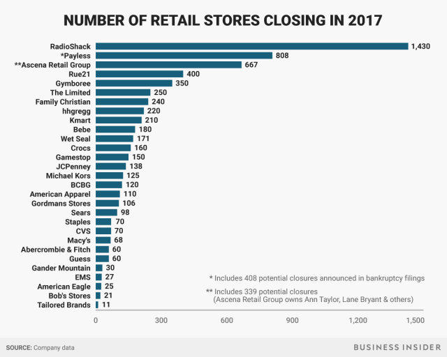 More than 6,300 stores are shutting down — here’s the full list August 1, 2017 ~ planbincomeproducers Retailers are closing thousands of stores following years of declines in sales and customer traffic. We compiled a list of the 6,375 closures that have been announced so far in 2017. Here’s the full list: Share this: Share on X (Opens in new window) X Share on Facebook (Opens in new window) Facebook Like Loading... Related